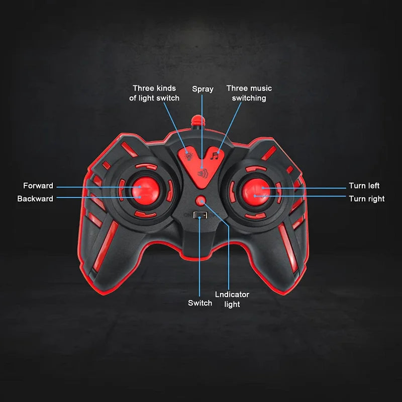 - Product functions: forward and backward, left and right turn,light music,spray